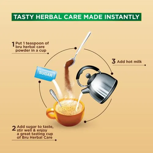 Bru Herbal Care is an instant coffee combined with the goodness of Ayurvedic ingredients, new from the House of Bru! With decades of experience, herbal care coffee is expertly crafted by Bru to give you the experience of the authentic taste of coffee with the benefits of Ayurvedic ingredients. Bru Herbal Care has Dry Ginger, Black Pepper, Coriander Seeds & Tulsi which are traditional Ayurvedic ingredients known to alleviate symptoms of cough and cold. These Ayurvedic ingredients are carefully blended with Instant Coffee so that all you need to do is add hot milk and sugar to enjoy a delicious cup of Bru Herbal Care.