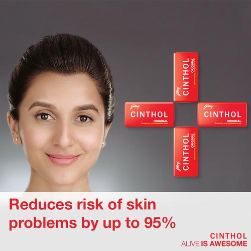 Cinthol Original Bath Soap protects you from exposure to sun, dust and pollution, and helps you prevent acne, blemishes and rashes. … Its high TFM keeps your skin healthy and glowing as it leaves the skin soft, supple and acne-free. As the name suggests, it is a deodorant soap, therefore the smell is long-lasting and powerful enough to keep bad odour away. Moreover, the fragrance makes you feel fresh throughout the day. Unlike other soaps, Cinthol’s range of soaps is gentle on the skin and keeps it cleans.