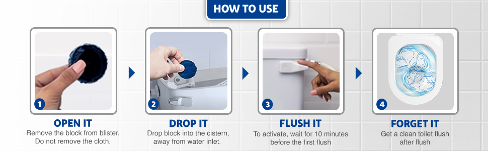 Harpic Flushmatic toilet cleaning cistern block is a drop-in tank tablet which can be used for any accessible cistern. It works by creating strong foam every time you flush the toilet, which helps to maintain cleanliness in the toilet bowl. Harpic Flushmatic toilet cleaner works from inside the cistern to release a dose of powerful detergent with every flush. Distributing the liquid across the bowl, it helps you maintain a hygienic and fresh toilet and prevents the build-up of stains, giving you a continuous clean toilet. You need not remove the pleated cloth wrapper on the block, as this will dissolve in the water until it finishes; just drop the block directly into the cistern. For best results, drop it at the opposite end to the water inlet by the float.