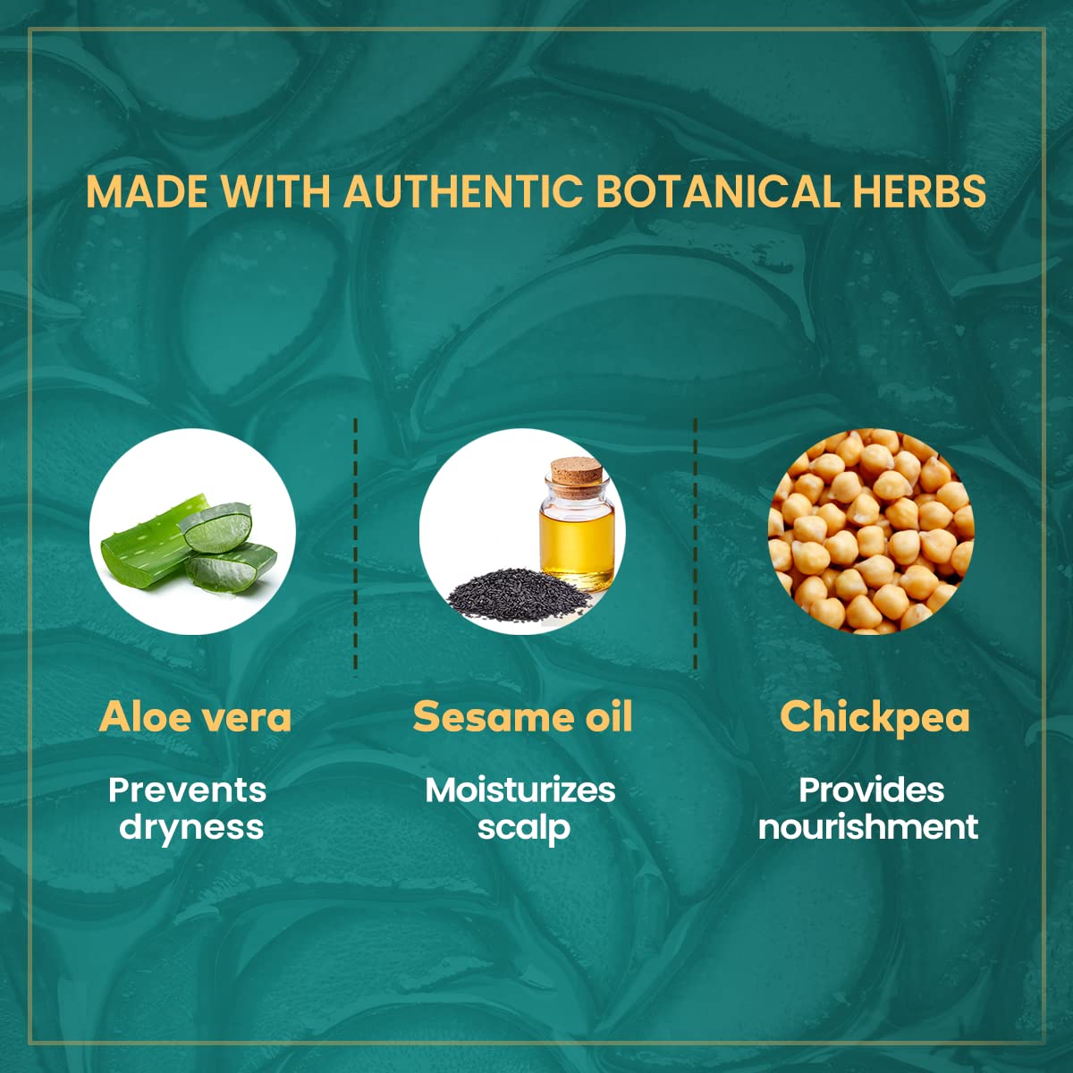 Aloe Vera, rich in nutrients, prevents hair from drying. Sesame Oil, an effective emollient, provides deep moisture to scalp and hair, from root to tip. Chickpea is a rich source of natural protein which helps to nourish hair.