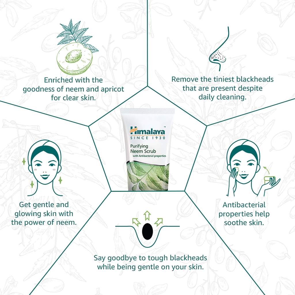 Purifying Neem Scrub Exfoliates and purifies for clear, problem-free skin. Himalaya’s Purifying Neem Scrub removes impurities and dead skin. It also cleanses excess oil from the skin’s surface, which is one of the root causes of acne.