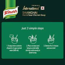 International Soup Knorr has hand-picked the best quality vegetables and mixed it with spices to make delicious Knorr Shanghai Hot & Sour Chicken Soup. It's a little hot, a little sour with real chicken and bite of crunchy cabbage, carrot and leeks, giving it its lip smacking taste and perfect consistency everytime