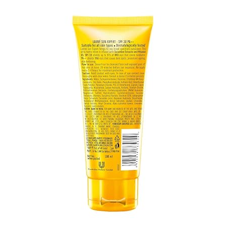 Lakme Sun Expert SPF 30 Ultra Matte Sunscreen Lotion blocks the sun’s harmful UVB rays and lets you bask in the sunshine without worry. This daily sunscreen provides a broad UV spectrum, protecting you from both UVA and UVB rays in the harshest summers. The unique formulation of this lotion also prevents dark spots, premature ageing and skin darkening. Enriched with the organic extracts of Cucumber and Lemongrass, it leaves your skin with a natural glow. So what are you waiting for? Buy the product online at the best rate, right here!