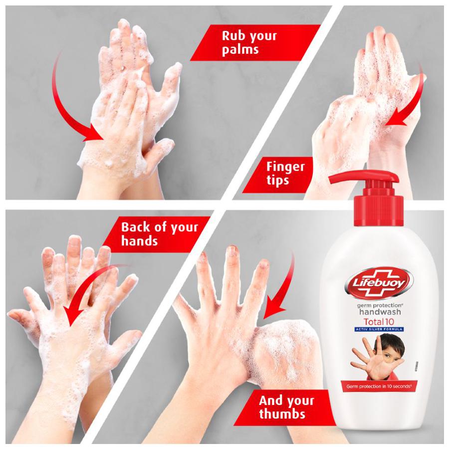 Lifebuoy Total 10 Germ Protection Handwash 190 ml With Refill Pouch 185 ml Free Lifebuoy Care soap bar is specially formulated to give both germ protection and care. It contains the goodness of milk cream and gives your skin a soft and smooth feel. … Good personal hygiene makes the skin healthy, which can then help protect against infection causing germs. Activ Silver Formula, that gives you 99.9% germ protection* with every wash.