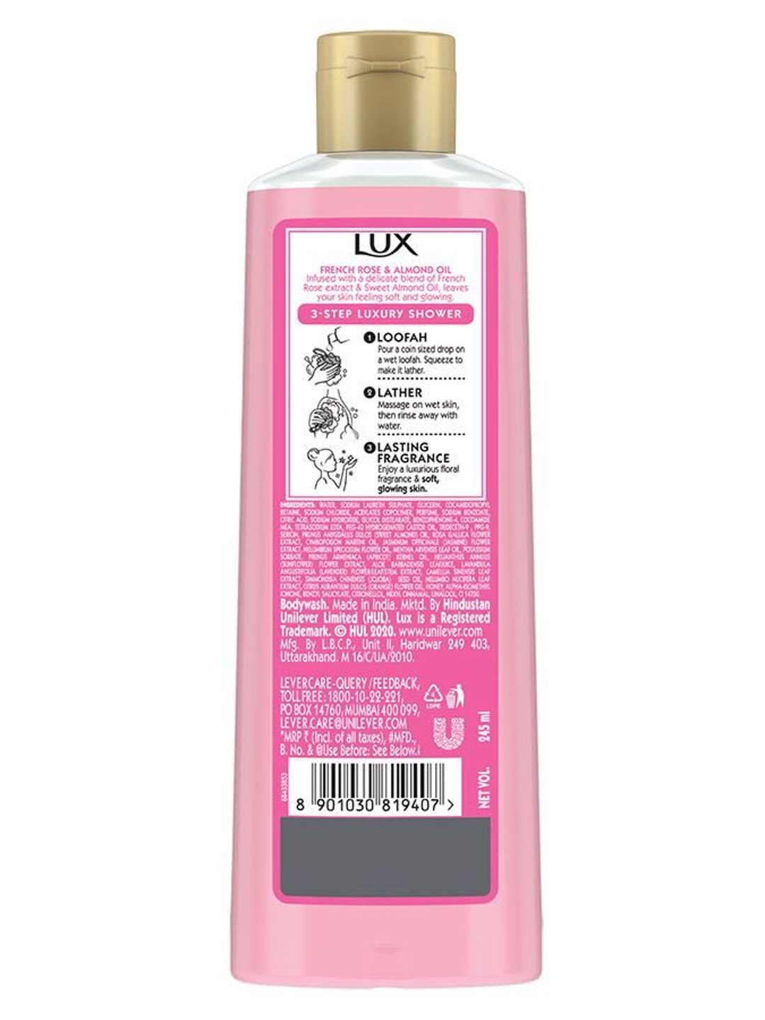 Ingredients: Water, Sodium Laureth Sulphate, Glycerine, Cocamidopropyl Betaine, Sodium Chloride, Acrylates Copolymer, Perfume, Sodium Benzoate, Citric Acid, Sodium Hydroxide, Glycol Distearate, Benzophenone-4, Cocamide Mea, Tetrasodium Edta, Peg-40 Hydrogenated Castor Oil, Trideceth-9, Ppg-9, Sericin, Prunus Amygdalus Dulcis (Sweet Almond) Oil, Rosa Gallica Flower Extract, Cymbopogon Martini Oil, Jasminum Officinale (Jasmine) Flower Extract, Nelumbium Speciosum Flower Oil, Mentha Arvensis Leaf Oil, Potassium Sorbate, Prunus Armeniaca (Apricot) Kernel Oil, Helianthus Annuus (Sunflower) Flower Extract, Aloe Barbadensis Leaf Juice, Lavandula Angustifolia (Lavender) Flower/Leaf/Stem Extract, Camellia Sinensis Leaf Extract, Simmondsia Chinensis (Jojoba) Seed Oil, Nelumbo Nucifera Leaf Extract, Citrus Aurantium Dulcis (Orange) Flower Oil, Honey, Alpha-Isomethyl Ionone, Benzyl Salicylate, Citronellol, Hexyl Cinnamal, Linalool, Ci 14700