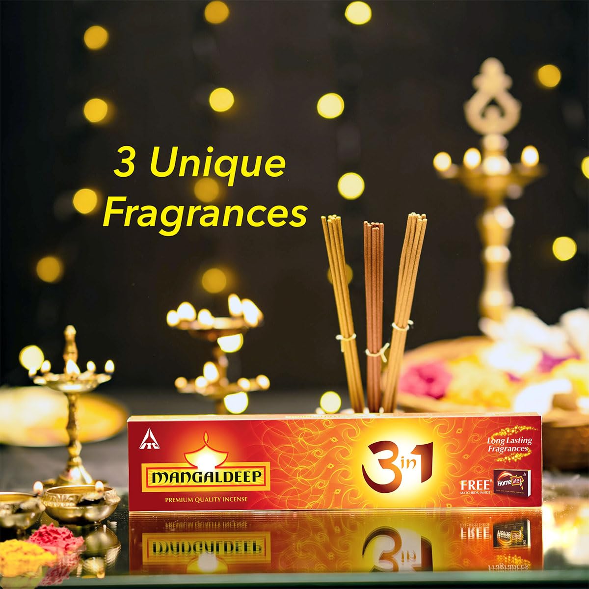 Mangaldeep brings to you its new 3-in-1 agarbatti with 3 unique long-lasting fragrances. The Mangaldeep 3-in-1 agarbatti brings you fragrances that last even after your prayers. The fragrances linger long after the agarbatti has been extinguished to create a positive and auspicious atmosphere at home. 3 differently coloured agarbattis in 3 unique traditional perfumes and fusion fragrances. One of the best launches from the house of Mangaldeep. Every agarbatti pack undergoes 24 rigorous quality checks to provide you the perfect devotional and spiritual experience. These have been crafted with premium quality brown battis with 0% charcoal.