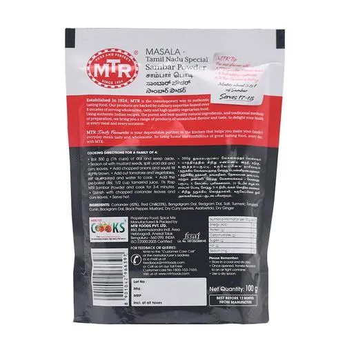 MTR Sambar Powder the traditional taste of home-made sambar. sambhar powder is added only in small quantities however, the use of peppercorns, cumin and coriander are known to improve digestion and immune functions.The herbs and spices used in sambar, like curry leaves, mustard seeds, turmeric powder, etc. have many health benefits like improved digestion, high immunity, and weight loss.