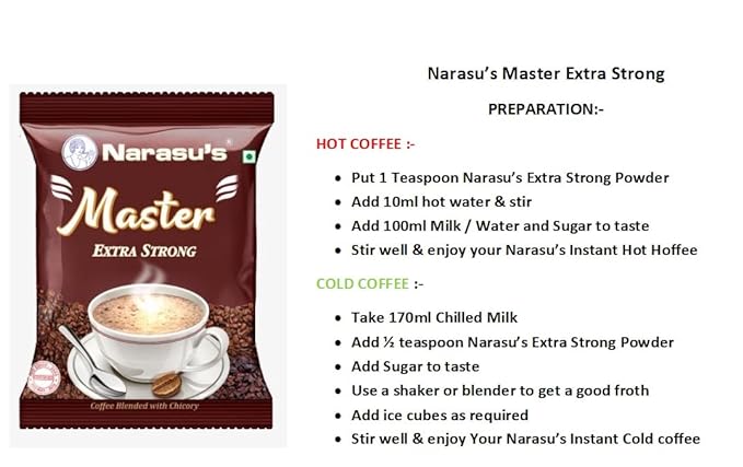 Enjoy a hot cup of Coffee made from Narasu's Coffee in the morning or evening along with your friends and family. The delicious taste and aroma of the fresh Coffee beans produced from the gardens of South India deliver instant energy and freshness. It tastes better when consumed along with some savouries or cookies. Narasu's Instant Coffee is a beverage derived from brewed coffee beans. Through various manufacturing processes, the coffee is dehydrated into the form of powder or granules. It offers a great cup of aromatic coffee that makes those moments of genuine warmth, strong and happiness even more special. Instant Coffee -Chicory mixture made from blends of coffee and chicory. Coffee-60% and Chicory-40%.