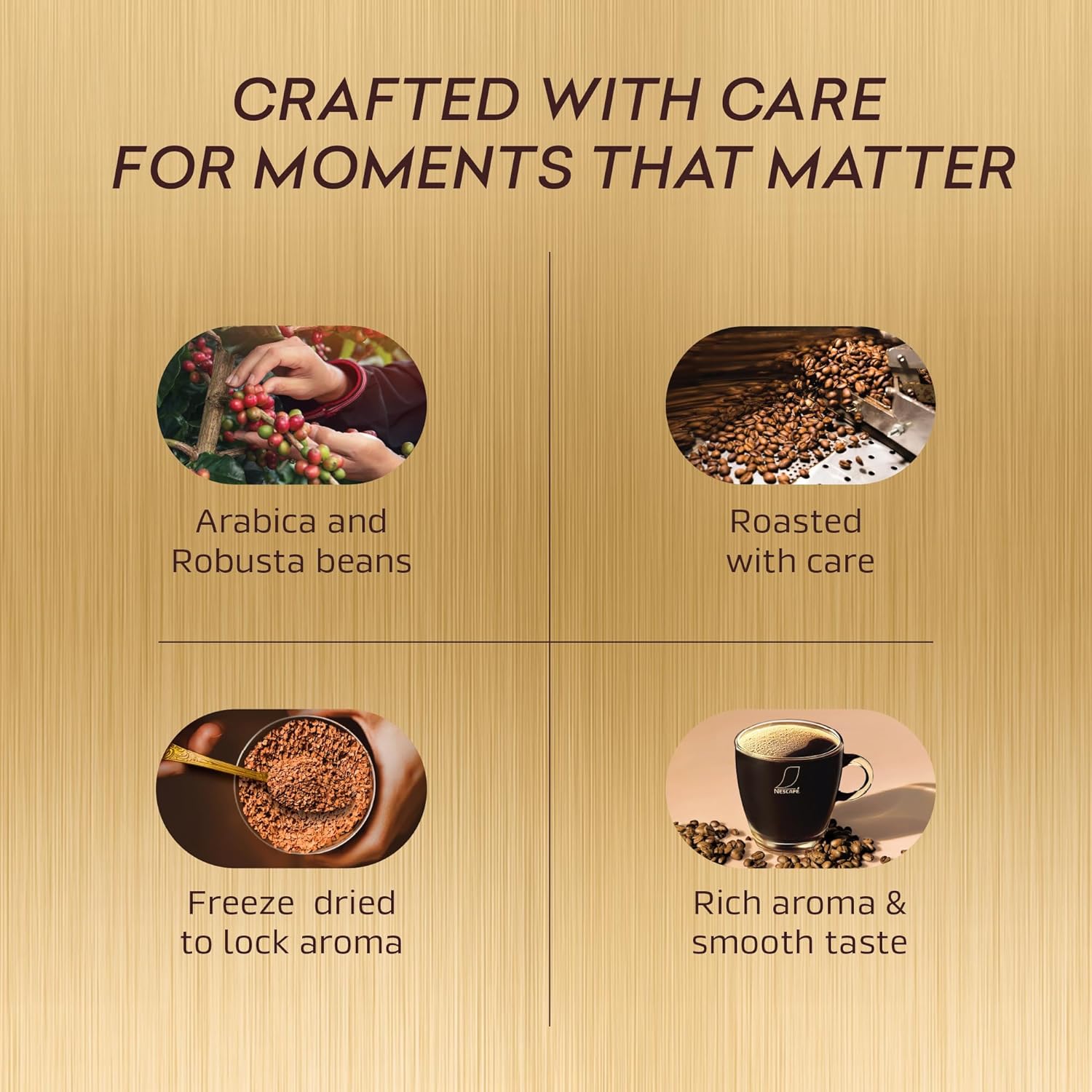 Nescafe brings you the premium choice for your special cup of coffee every day, rising above all to the highest standards set by coffee connoisseurs. This premium imported roast is artfully crafted to achieve a quality coffee experience that will awaken your senses. Nescafe Gold is a sophisticated aromatic coffee with a rich and well-rounded taste that creates delicious moments instantly.