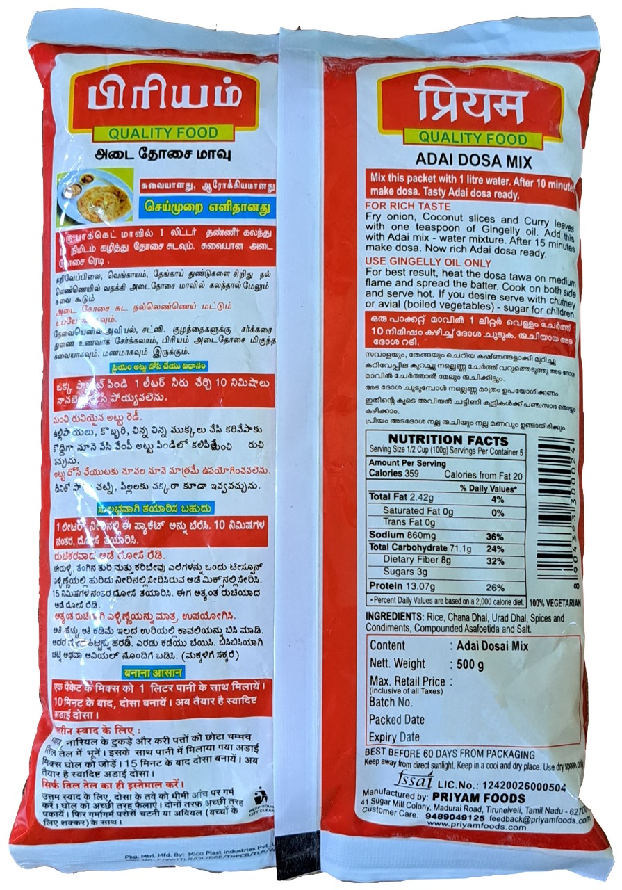 Experience the rich flavors of South India with Priyam Adai Dosa Flour. Our expertly crafted blend of rice and lentils creates a deliciously crispy and golden Adai Dosa, just like homemade.