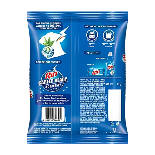 Rin detergent powder breathes life back into your whites and coloured clothes so that they shine like new. It dissolves quickly in water, targets and gets rid of the toughest of dirt without leaving any residue on your fabrics. It also has a fragrance which ensures your clothes smell fresh and make you feel refreshed all day.