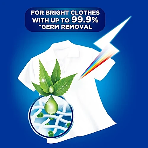 Rin Anti-Bac is an Anti-bacterial Detergent Powder with Neem. It enables Up to 99.9 % Germ removal with Ayurvedic extracts. New Rin Antibac has total clean technology with Ayurvedic extracts that gives the confidence of dazzling white and bright clothes that are 99.9% germ-free. With its superior technology, this detergent powder brightens your whites and coloured clothes.