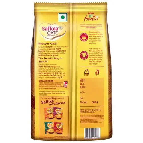 Saffola Rolled Oats – 100% Natural With High Protein & Fibre, Healthy Cereals Saffola Oats are made with 100% natural wholegrain rolled oats. Its grains are so soft that it provides a super creamy texture to your breakfast. Porridge prepared by Saffola Oats is so creamy that it melts in your mouth. Relish a quick bowl of Saffola Oats by simply adding your favorite toppings like fruits, honey, syrup etc. Ready in 3 minutes; Saffola Oats can be had as a hot bowl of oats or a yummy cold dessert. Apart from porridge, you can also try other lip-smacking recipes like Oats Upma, Uttapam, Daliya, Smoothies etc. as these soft grains blend easily into your recipes.
