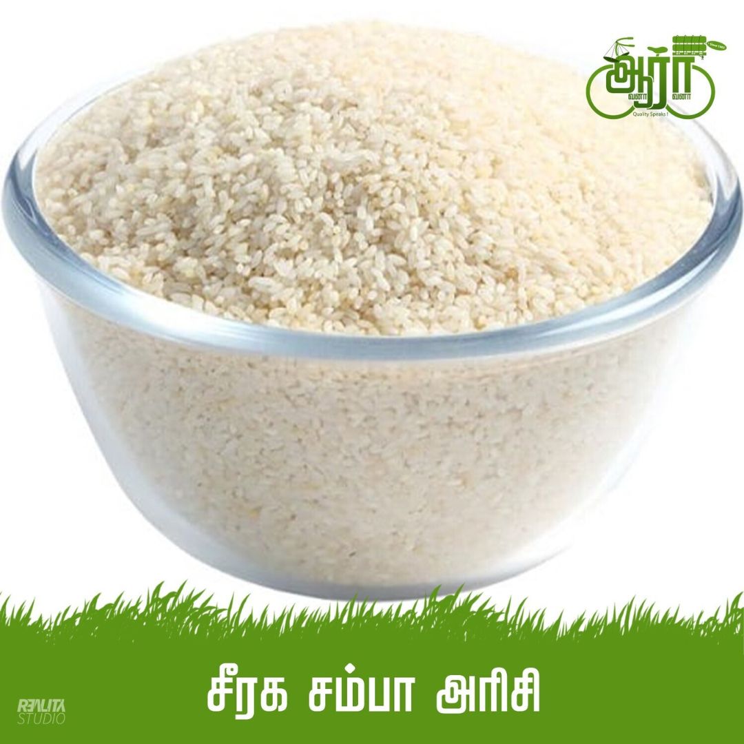 Seeraga samba rice It helps in preventing colon and bowel cancer. It is good for diabetics. Cumin samba rice is low in sodium. It is considered as one of the best alternatives for people with high blood pressure and hypertension. Even obese people can take this rice. It contains a lot of fiber and protein.Boosts the immune system and helps fight viruses and bacteria. சீரக சம்பா அரிசி இது பெருங்குடல் மற்றும் குடல் புற்றுநோயைத் தடுக்க உதவுகிறது.இது நீரிழிவு நோயாளிகளுக்கு நல்லது.சீரக சம்பா அரிசியில் குறைந்த அளவு சோடியம் உள்ளது. உயர் இரத்த அழுத்தம் மற்றும் உயர் இரத்த அழுத்தம் உள்ளவர்களுக்கு இது சிறந்த மாற்றுகளில் ஒன்றாக கருதப்படுகிறது. உடல் பருமன் உடையவர்கள் கூட இந்த அரிசியை எடுத்துக் கொள்ளலாம். இதில் நிறைய நார்ச்சத்துக்கள் மற்றும் புரோட்டீன்கள் காணப்படுகிறது.நோயெதிர்ப்பு சக்தியை அதிகரித்து வைரஸ் மற்றும் பாக்டீரியாவை எதிர்த்து போராட உதவுகிறது.