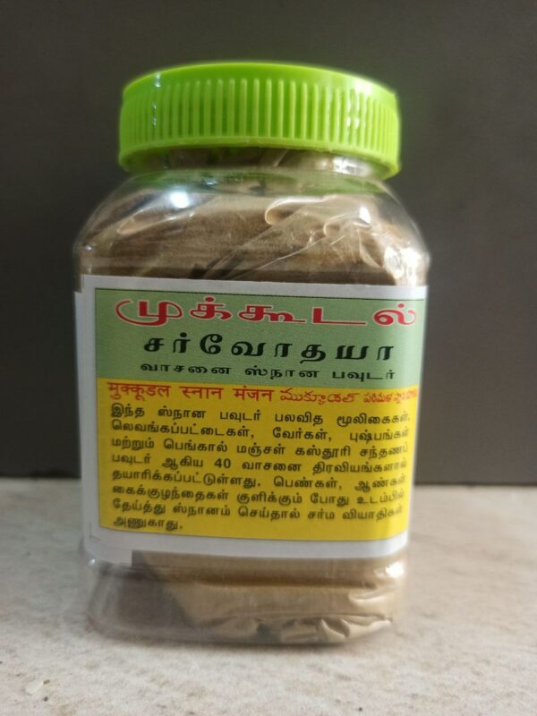 This natural herbal bathing womens powder contains a soothing blend of ingredients traditionally used in Ayurvedic healthcare. Sandalwood, turmeric, tulsi, rose petals, orange peel, and other herbs come together to cleanse and nourish your skin. Directly applying the powder and washing allows the benefits of akilam, thimiratam, vilangam, and other ingredients to be absorbed.