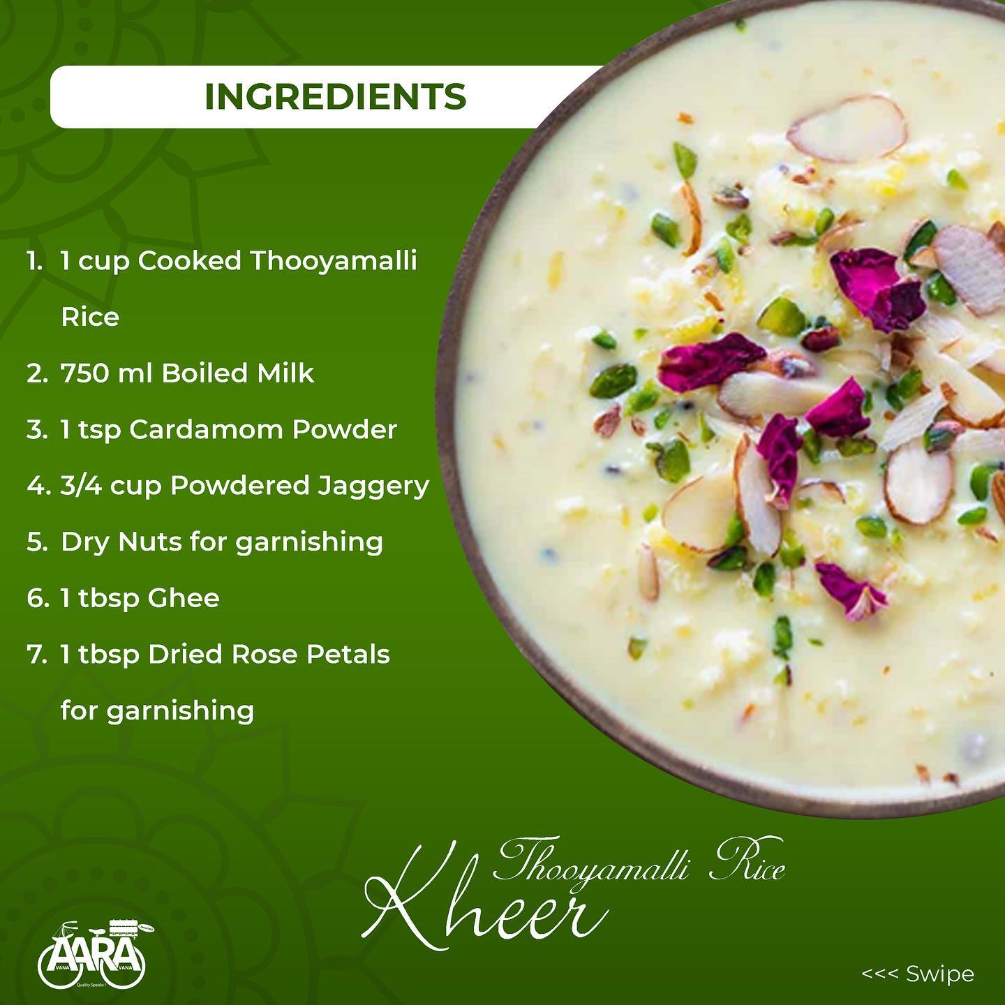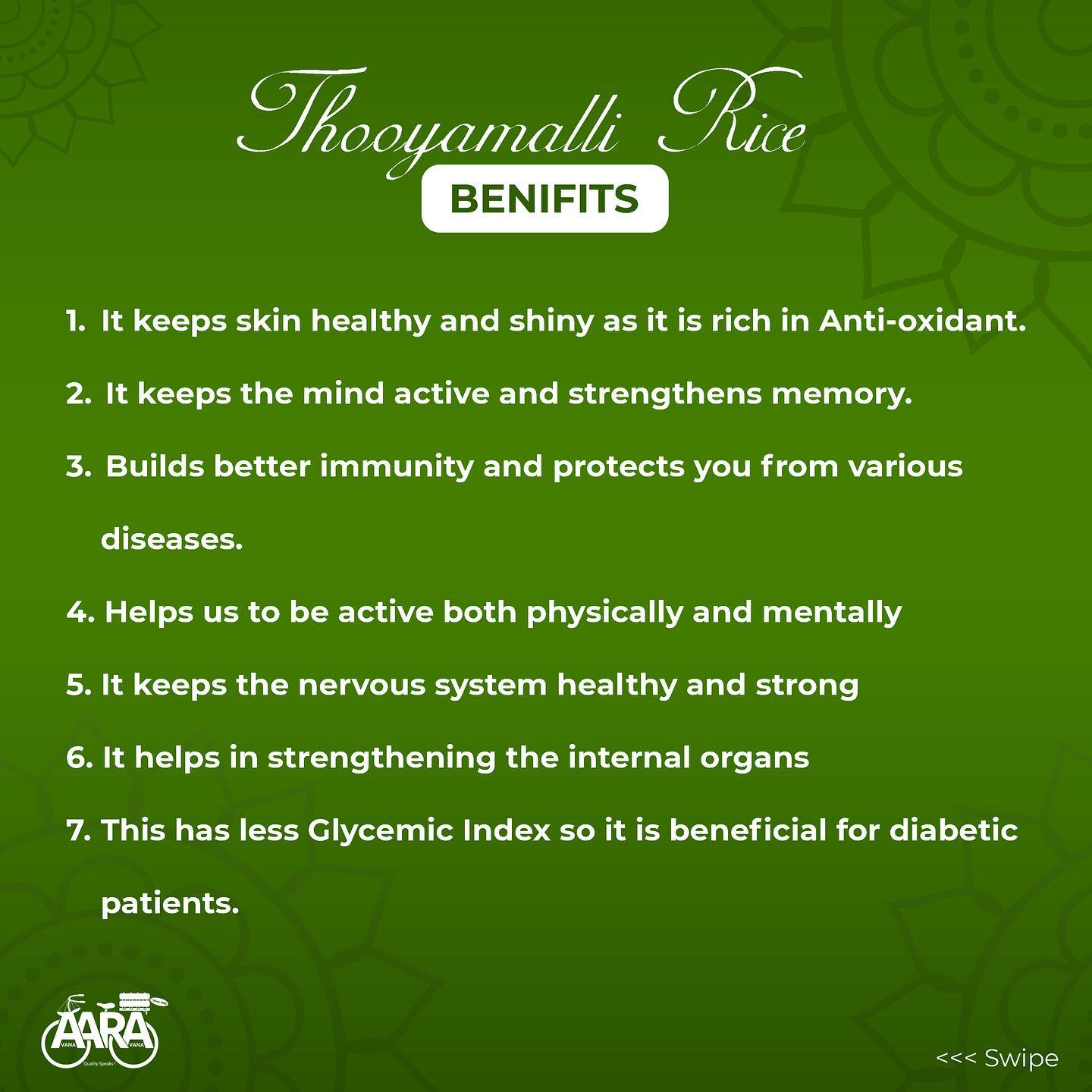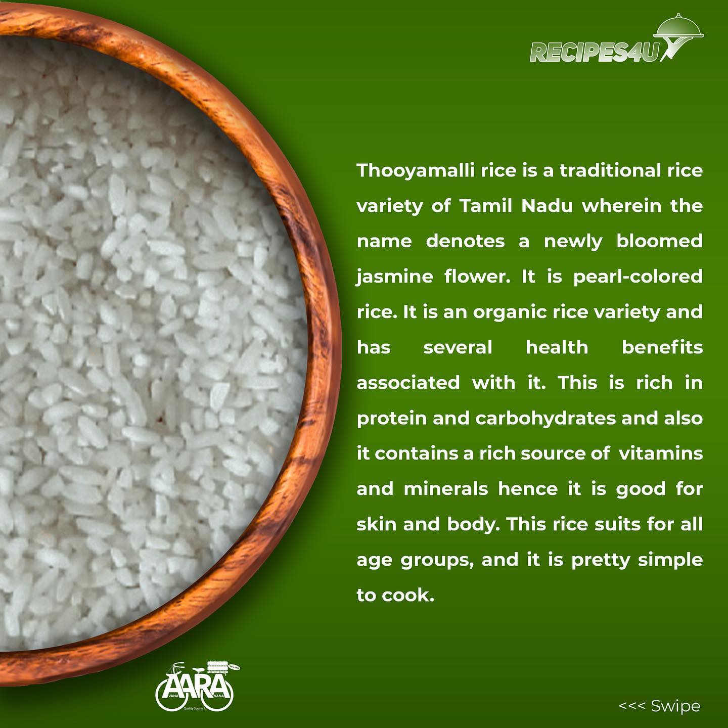 Thooyamalli rice is a traditional rice variety of Tamil Nadu wherein the name denotes a newly bloomed jasmine flower. It is pearl-colored rice. It is an organic rice variety and has several health benefits associated with it. This is rich in protein and carbohydrates and also it contains a rich source of vitamins and minerals hence it is good for skin and body. This rice suits for all age groups, and it is pretty simple to cook. தூயமல்லி அரிசி என்பது தமிழ்நாட்டின் பாரம்பரிய அரிசி வகையாகும், கதிர் வரும் பொழுது பார்ப்பதற்கு மல்லிகை மொட்டு போல் இருக்கும் , அதனால் இது தூயமல்லி என்று அழைக்கப்படுகிறது. இது ஒரு பாரம்பரிய அரிசி வகையாகும் மேலும் இது பல ஆரோக்கிய நன்மைகளைக் கொண்டுள்ளது. இதில் புரதம், கார்போஹைட்ரேட்டுகள், வைட்டமின்கள் மற்றும் தாதுக்கள் நிறைந்துள்ளன, எனவே இது சருமத்திற்கும் உடலுக்கும் நன்மை பயக்கிறது. இந்த அரிசி எல்லா வயதினருக்கும் ஏற்றது மற்றும் சமைக்கவும் எளிதானது.