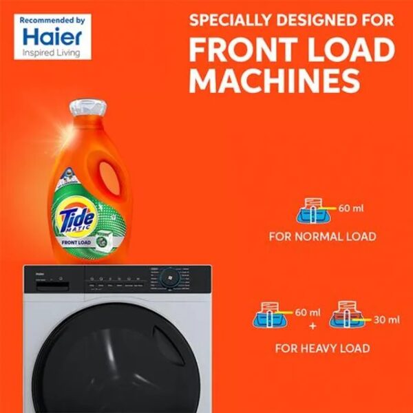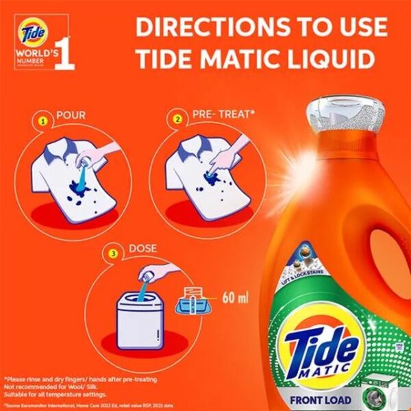 Tide Matic Front Load Liquid Detergent is convenient as completely soluble in water. It helps you clean your clothes easily while giving them a pleasant fragrance. It removes tough stains easily and protects colours. This liquid detergent is designed especially for automatic washing. Being a liquid detergent, it dissolves quickly in high water level environments of washing machines. This detergent is safe on all fabrics, wool, cotton, silk, blends, and all other fabrics.