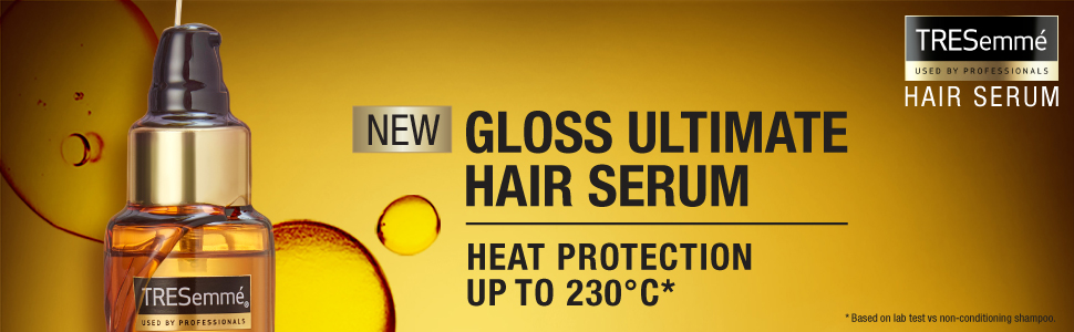 Gloss Ultimate Ultra Shine Hair Serum Salon style hair, with a super shiny finish Salon Quality TRESemme Gloss Ultimate Hair Serum, is infused with Vitamin E and a blend of 3 powerful oils nourishing Coconut oil, conditioning Macadamia Oil and moisturizing Sunflower Seed Oil provides glossy shine and deep nourishment to hair. It coats hair strands to give a salon a smooth, shiny finish at home. PRO TIP Before styling, use Gloss Ultimate Hair Serum to protect hair from heat damage up to 230*C and make unruly hair more manageable. Transforming dull hair to stylish glossy hair. Use Gloss Ultimate Hair Serum before styling to: