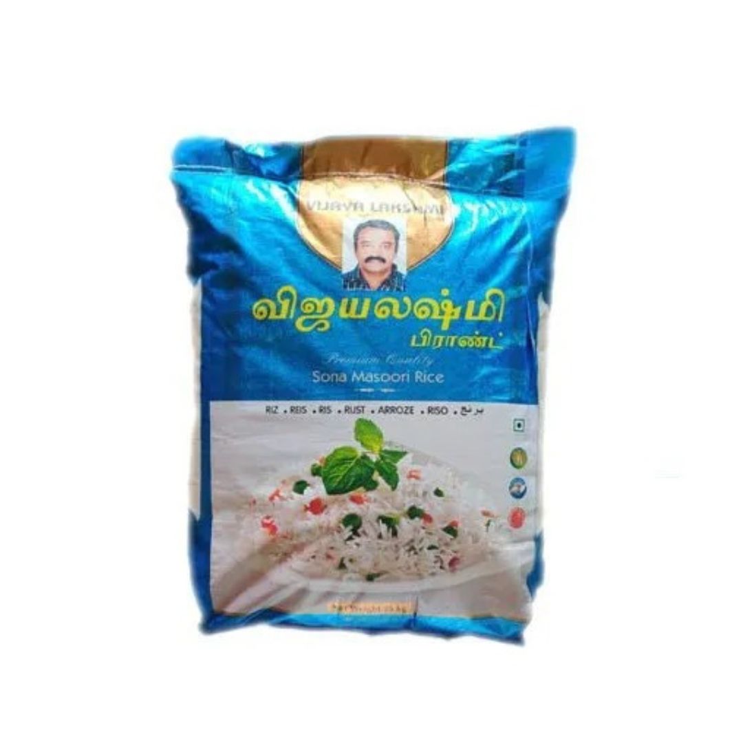 Vijayalakshmi arisi is a brand of rice that is available in different varieties, including ponni and sona massori.